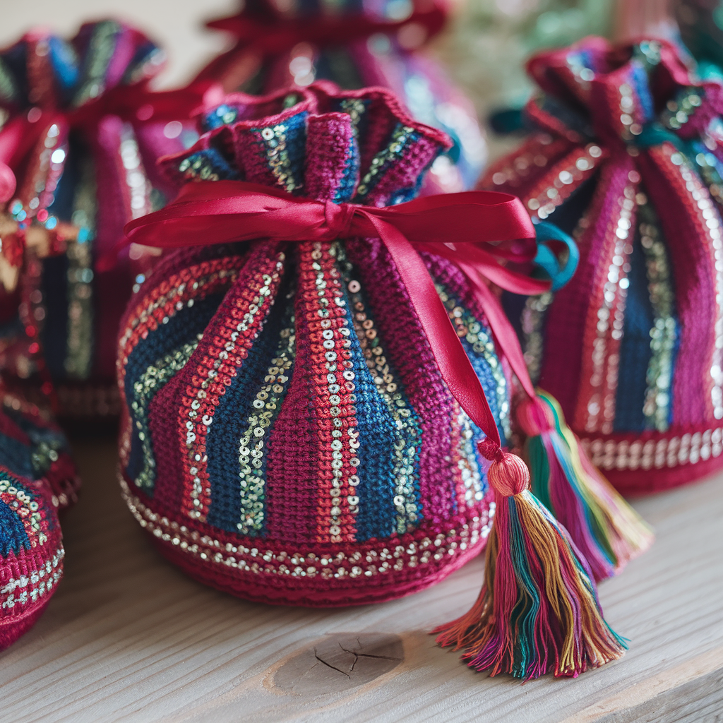 Built for celebrations: interchangeable color palette, optional sequin or metallic yarn accents.