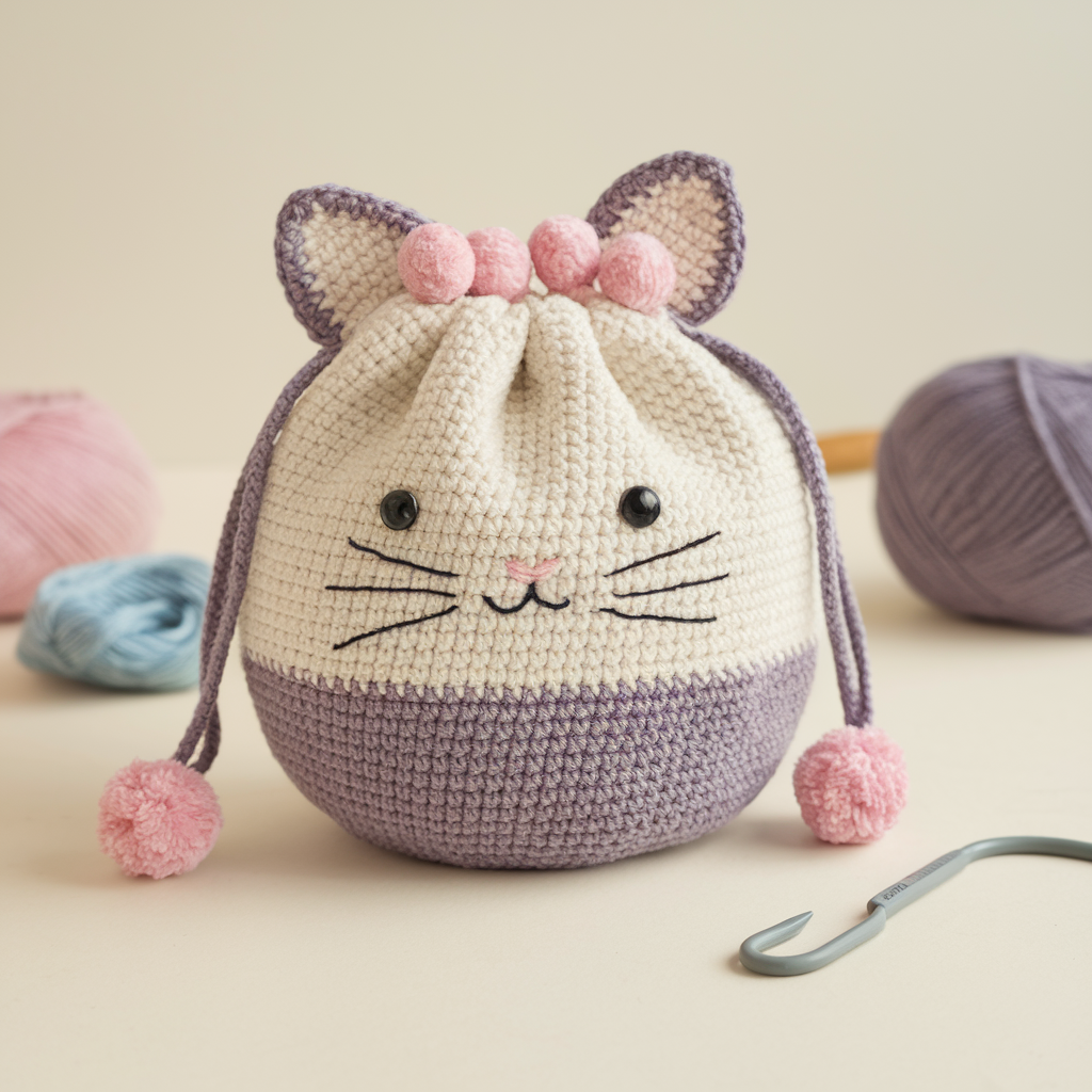 Work a basic round pouch (Basic pattern) in a solid color. Create a small separate flat round for the face patch, embroider or attach eyes and nose, crochet small triangle ears, seam ears onto top edge, then add eyelet row and drawstring.