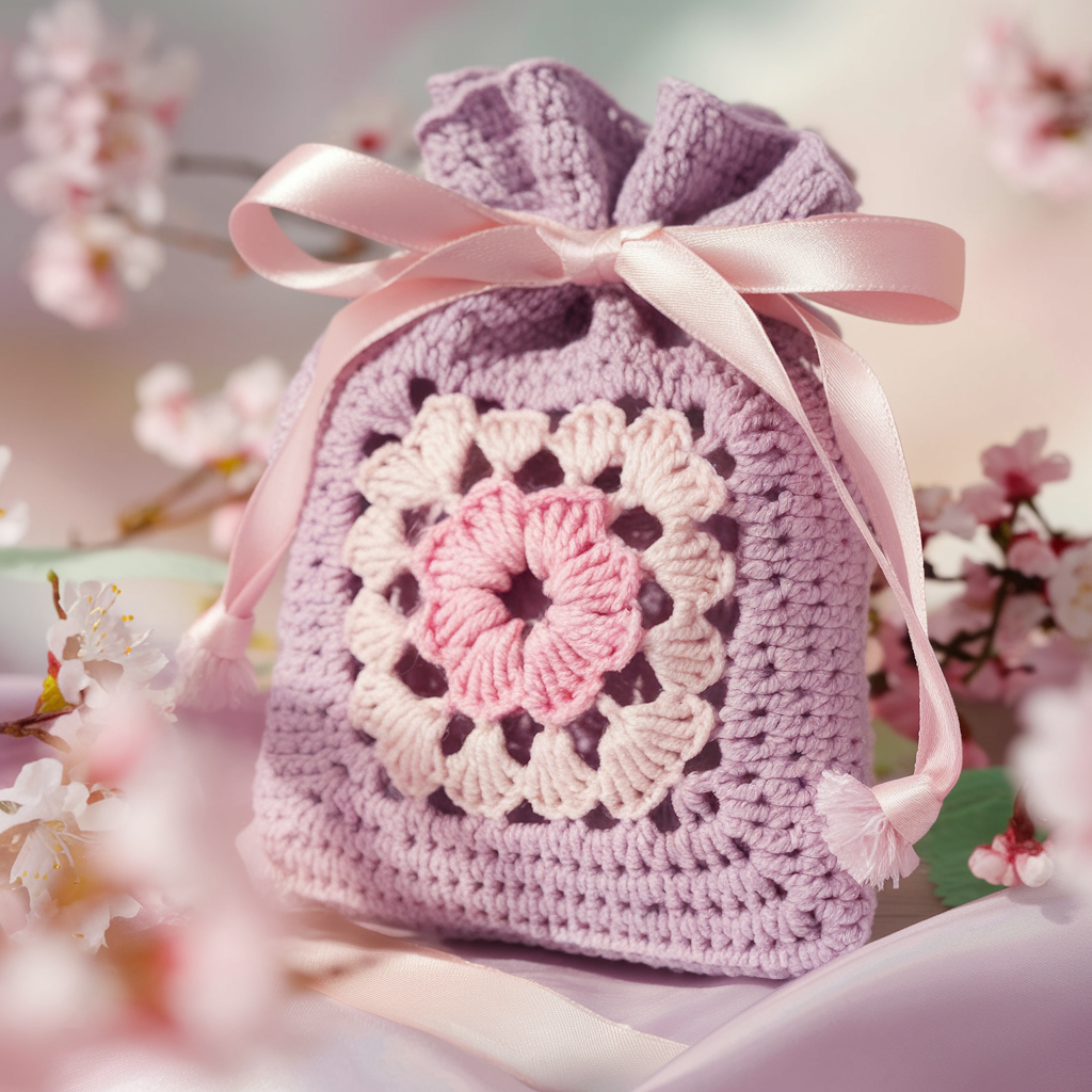 7. Crochet Sakura Granny Square Drawstring Pouch Pattern