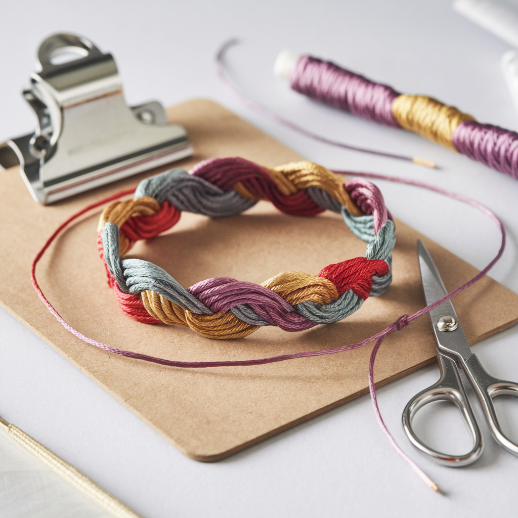- Embroidery floss or craft thread, 8 strands (4 colors, 2 strands of each color) — about 30–35 in per strand for cuff length