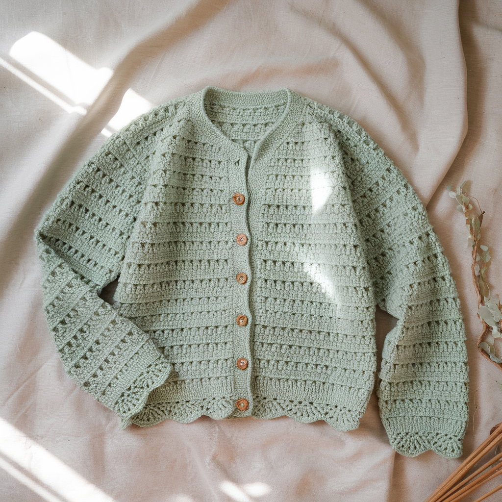 - Pick up stitches along front edges and work 6–8 rows of sc or ribbing (sc in BLO) for neat button bands. Add buttons and buttonholes spaced evenly.