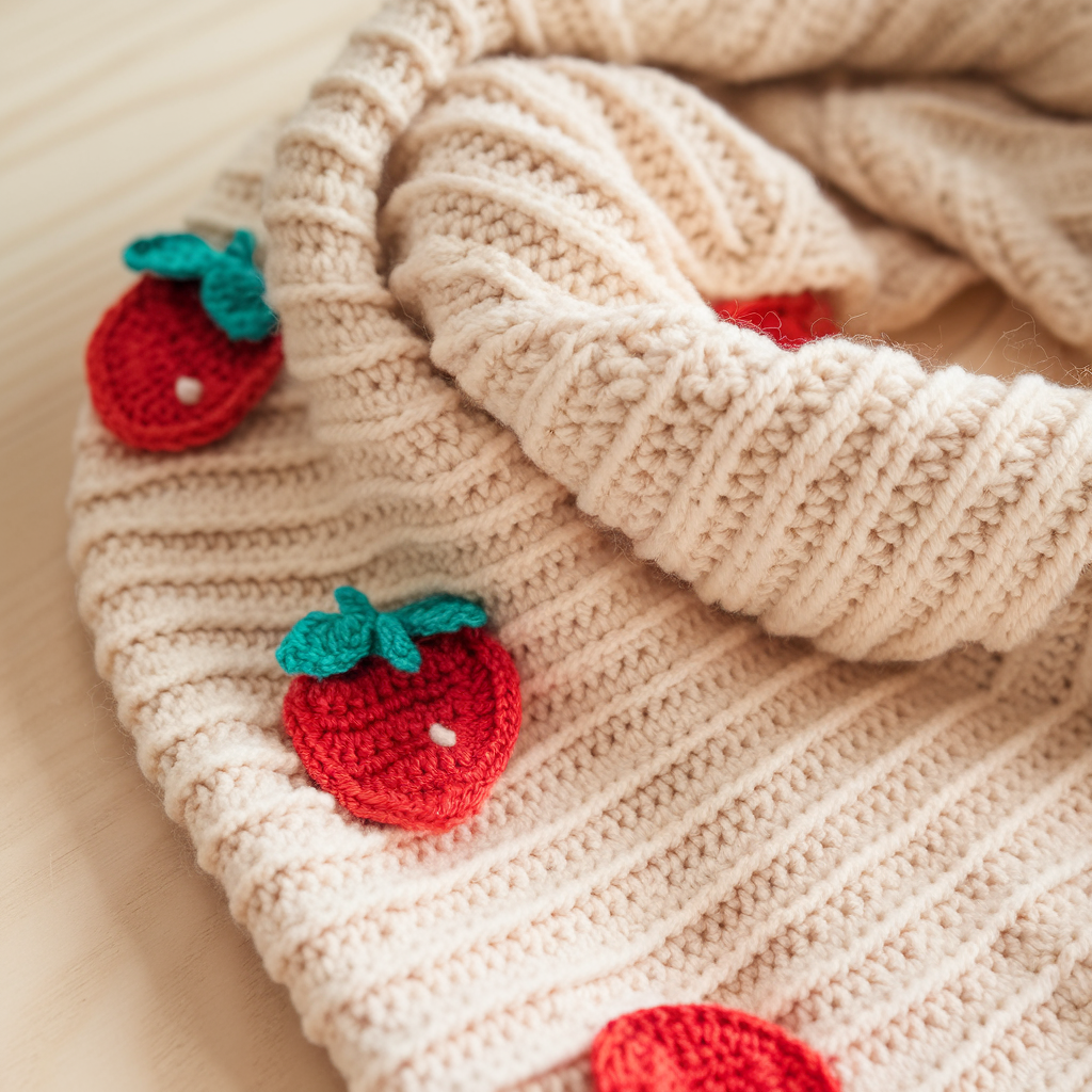- Arrange strawberries along one or both ends, or scattered across the scarf. Sew on with yarn needle using mattress stitch for flat joins.