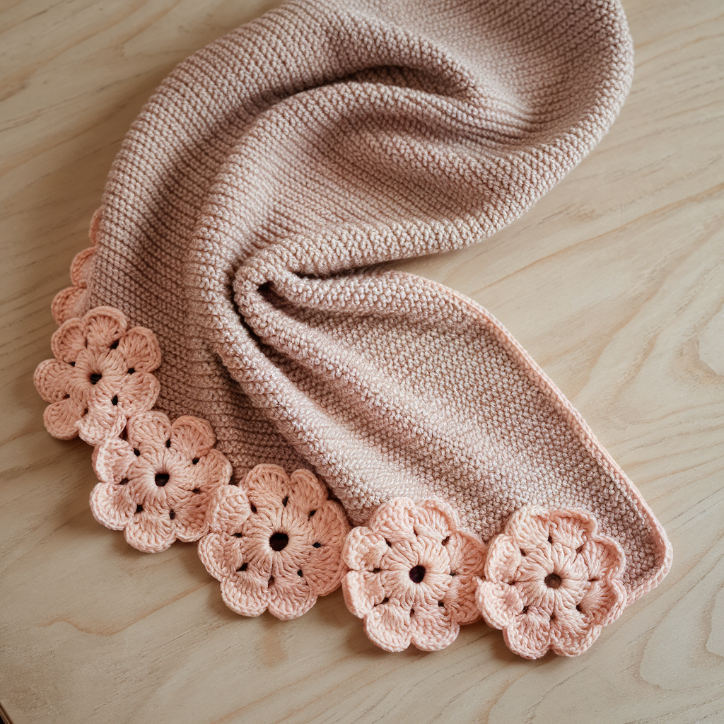 Concept: Scarf body is simple rows; one edge is embellished by a repeated flower motif that makes a scalloped decorative border.