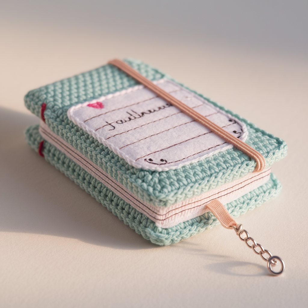 - Spiral binding (optional): Chain 10 in contrasting yarn and sew down the left edge like a spiral. Or stitch small black French knots for “spiral holes.”