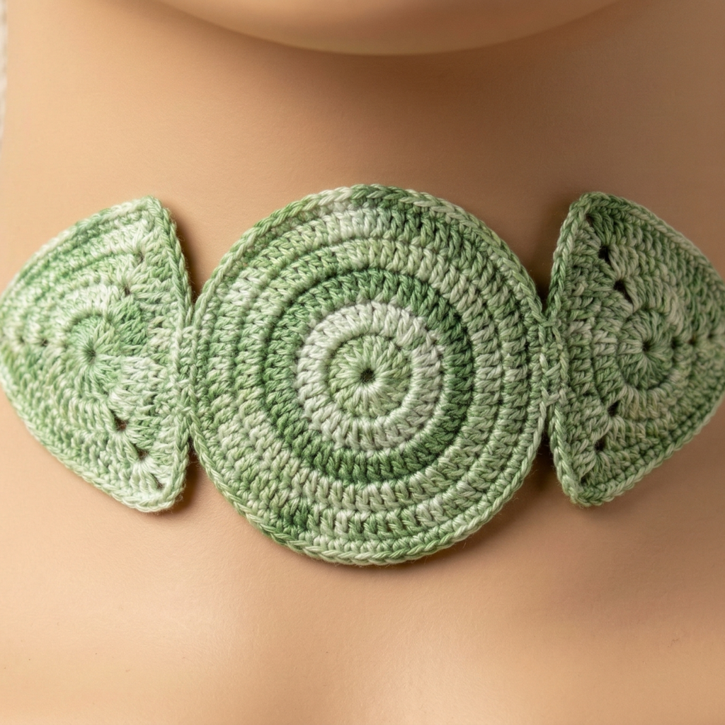 - Row pattern (example): Row 1: sc along chain; Row 2: ch3, sk 2, sc to create airy mesh; Row 3: shells into ch-spaces to form scallops. Repeat rows until panel reaches desired side length (~4–6″ depending on choker style). Mirror for second side.