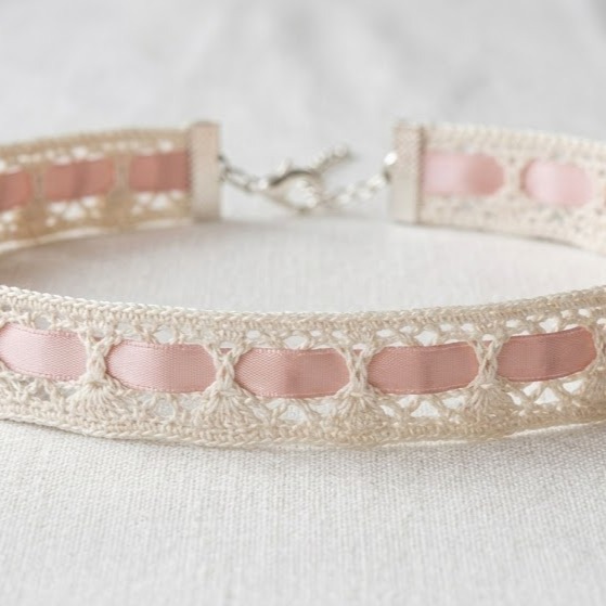 A narrow lace strip is quick to crochet and ribbon adds color and ties the choker together. Ribbon threaded through eyelets or picots makes the choker adjustable and comfortable.