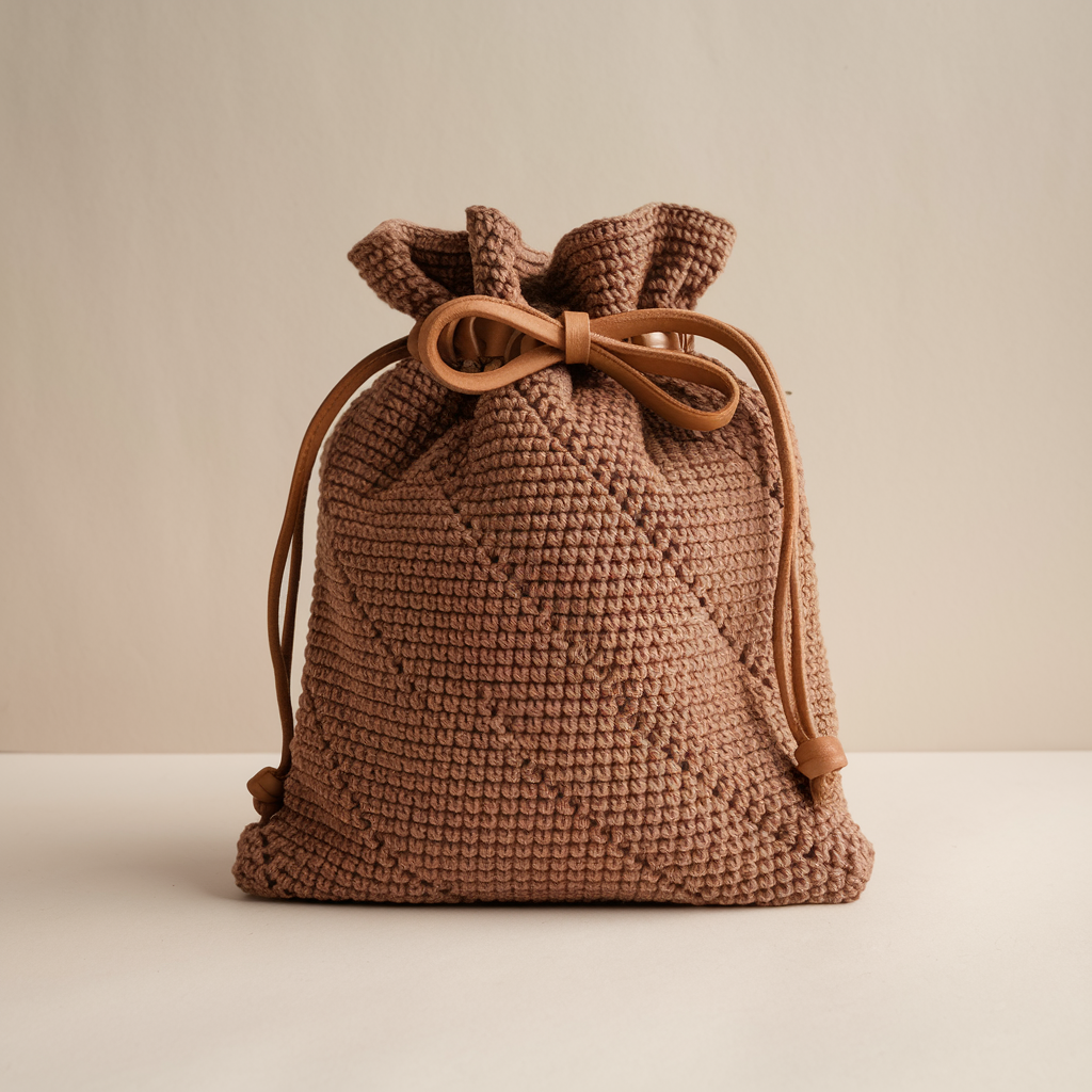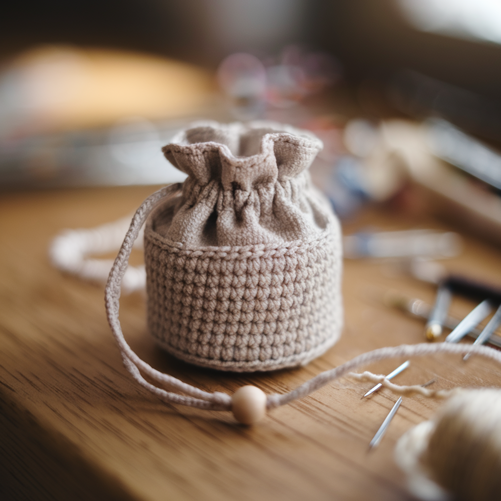 - Internal tunnel (classic): finish top with 2–3 rounds of sc, then a round of ch-loops (or picot) to create holes for passing the cord. Good for small bags.