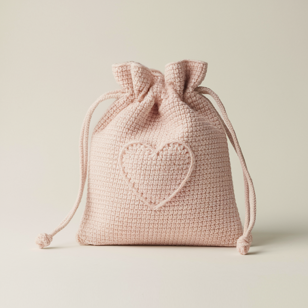 A cute, small bag with heart motif on front — great for gifts, jewelry, or a makeup pouch. Worked flat with a heart panel and body panel joined.