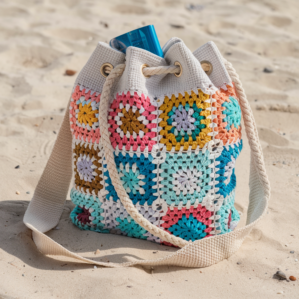 A fun large drawstring bag constructed from granny squares — breathable, stretch friendly, and perfect for towels and sunscreen when lined or used open.