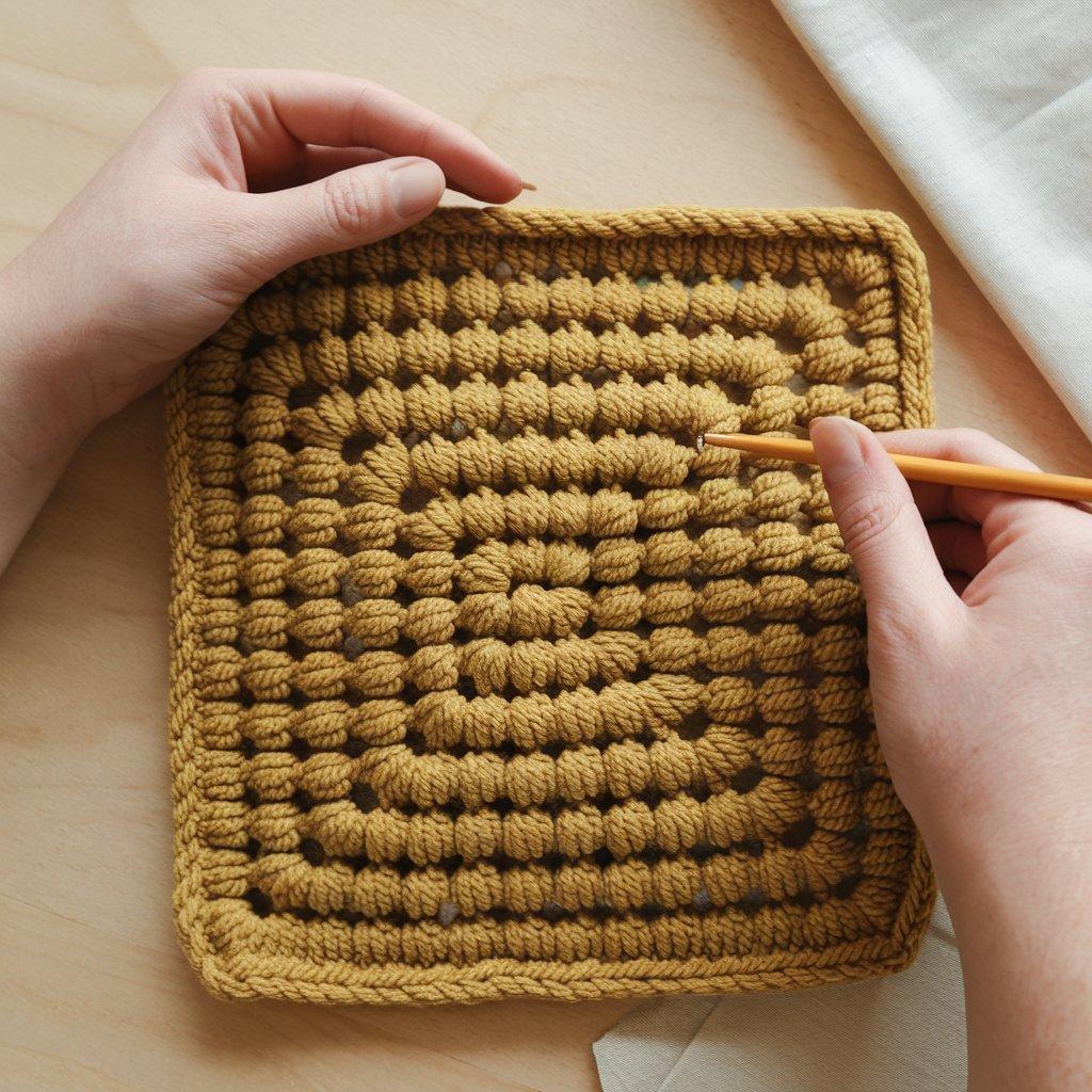 8. Add a tidy last round: sc around or crab-stitch (reverse single crochet) for a neat, slightly corded edge. Block square: pin corners to exact dimensions and steam- or wet-block according to yarn fiber.