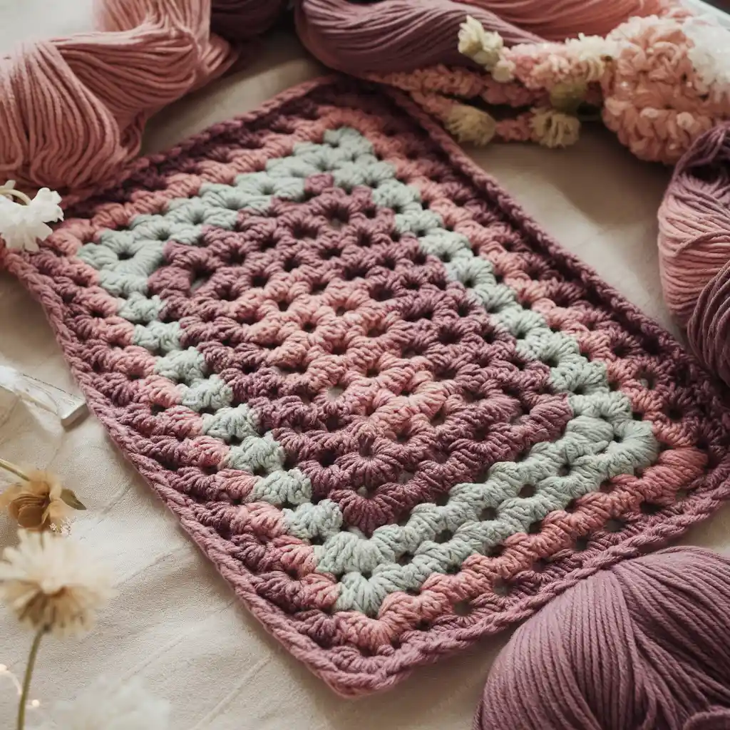 This solid granny uses tighter clustering to produce a dense fabric with minimal holes — ideal for bags, garments, and kids’ blankets.