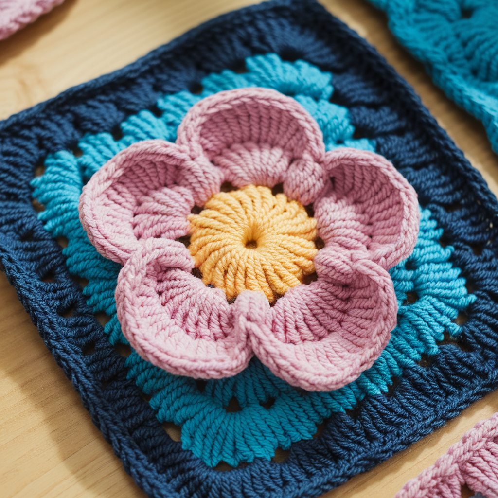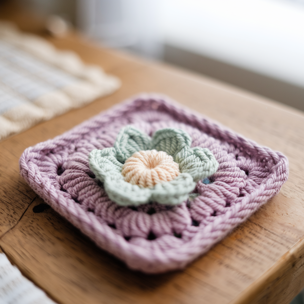 - Blocking: pin tiny square to precise size and steam-block lightly to open petals and set corners. Because the piece is small, blocking gives a professional finish.
