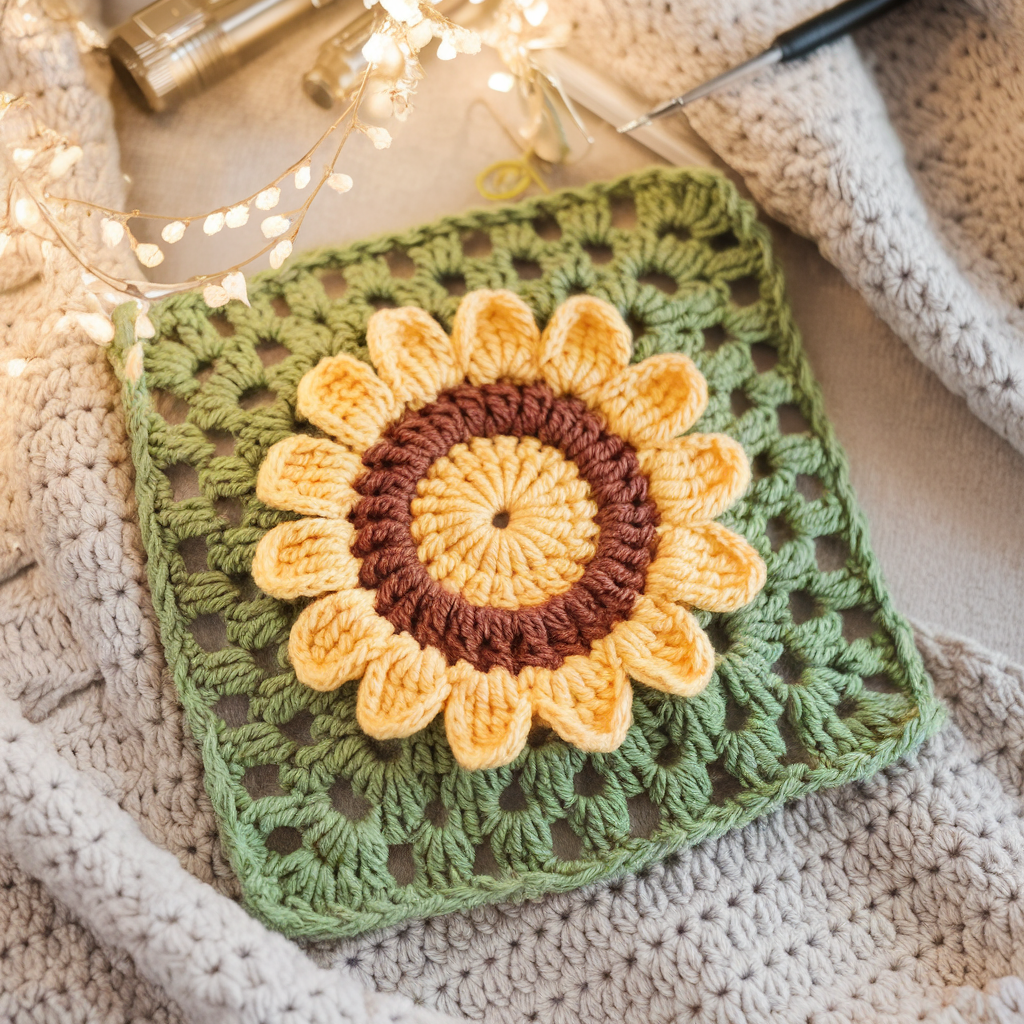- Worsted/Aran yarn: yellow (center/petals), brown (seed ring), green or background color(s). ~60–120 yards per square depending on rounds.