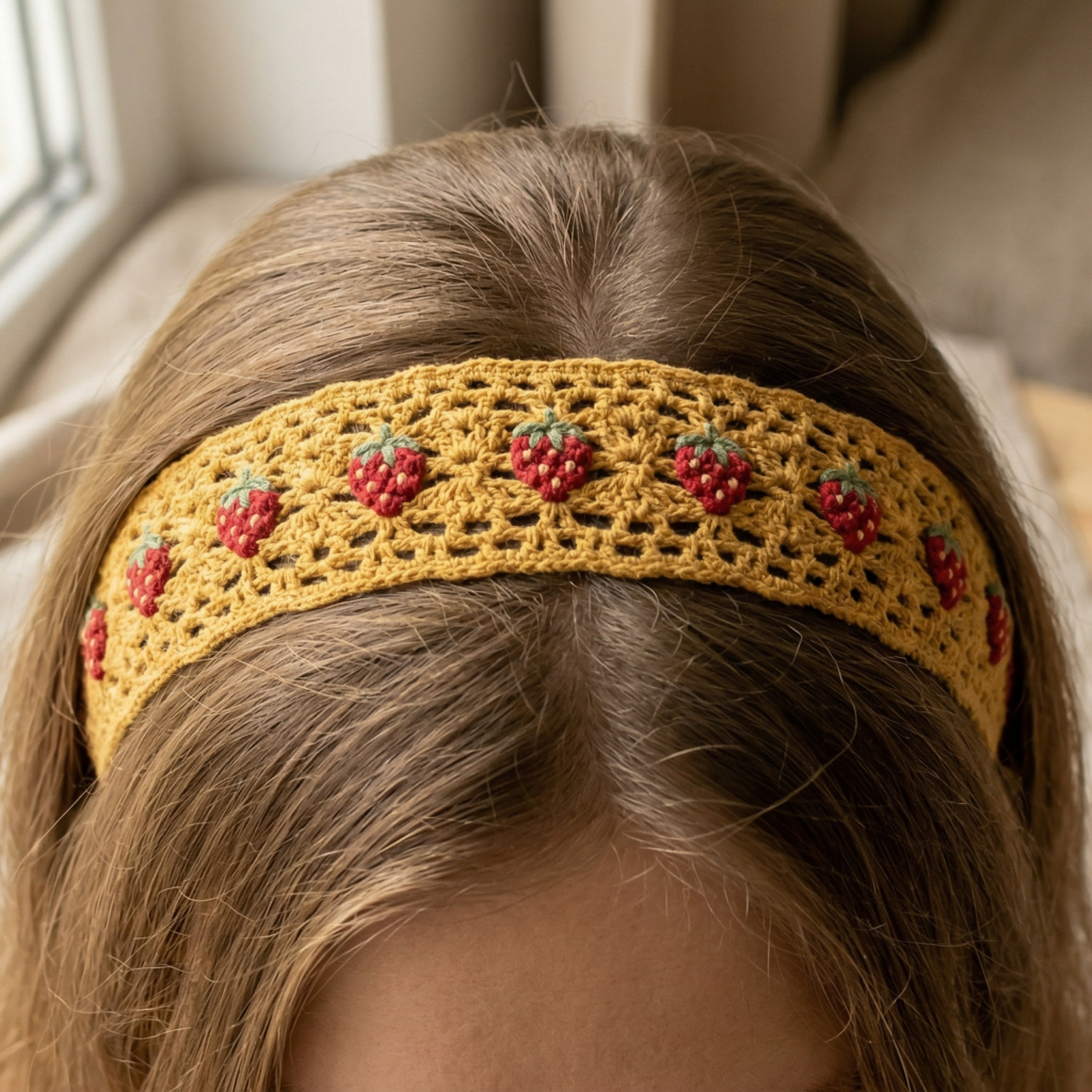 Begin the strawberry stitch pattern along the headband. This textured stitch creates a lovely raised surface that feels pretty and delicate. Keep the rows even so the texture remains balanced from one end to the other.