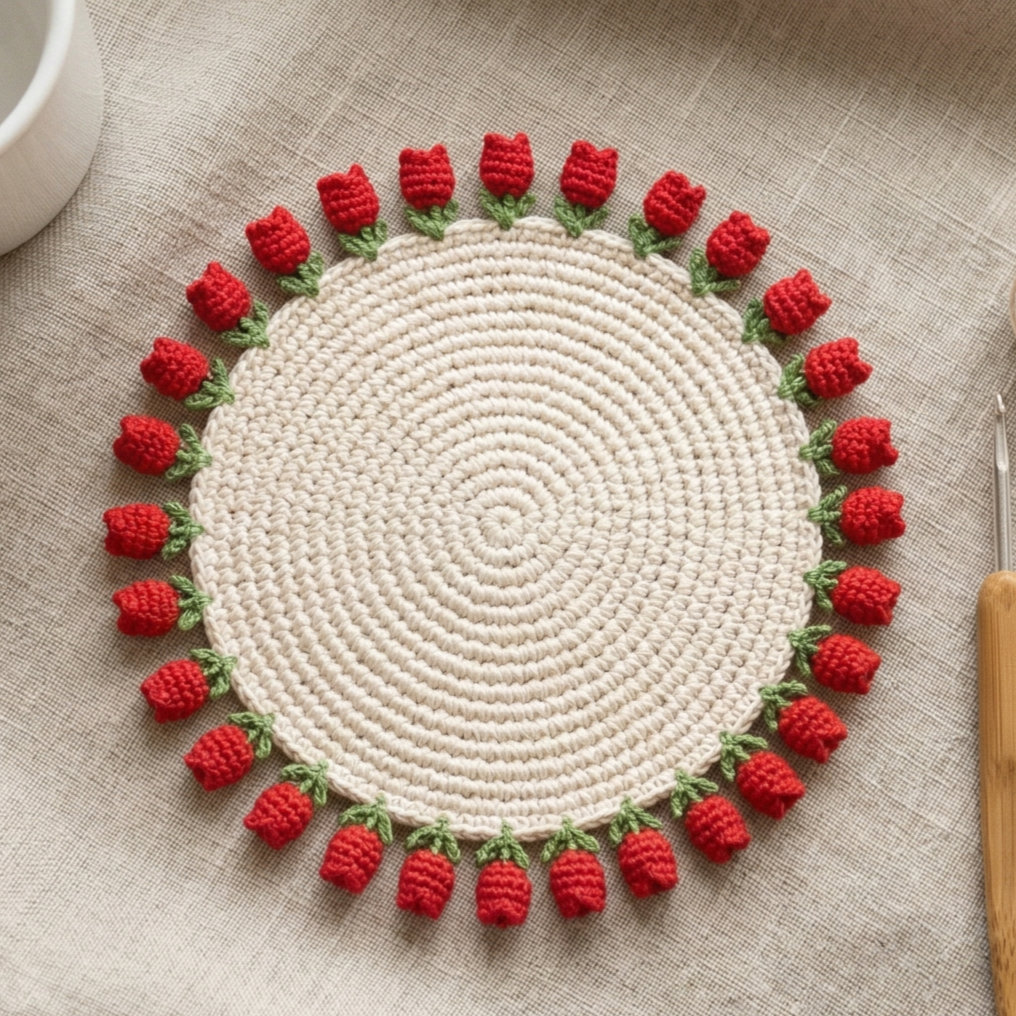 Make small tulip flowers separately or as appliqué pieces. Each tulip should have a simple bloom and a short green stem. Keep the motifs small enough to fit neatly on the coaster without making it bulky. The flower shapes should feel sweet and balanced.