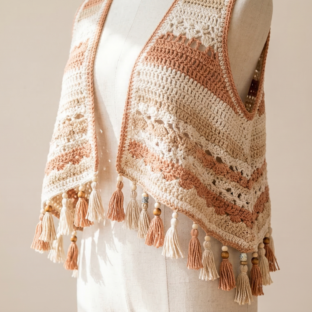 This vest is all about texture and personality. The tassels and beads create movement and charm, while the vest shape stays easy and wearable.