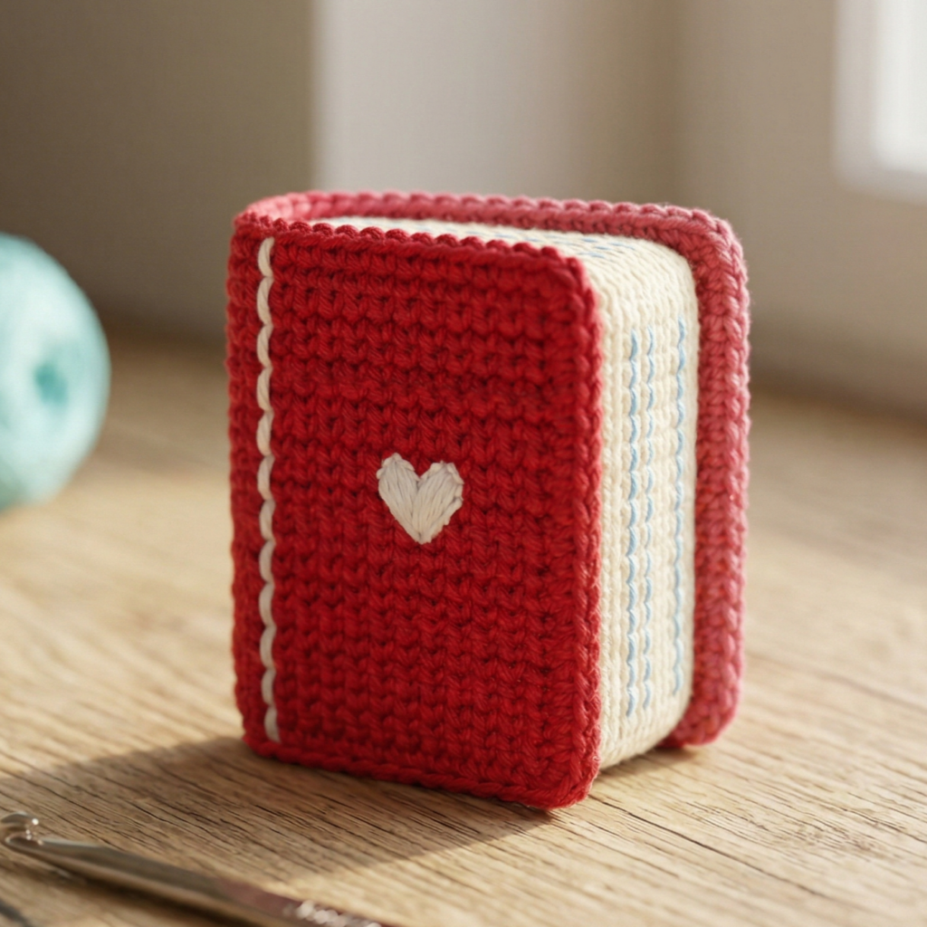 Weave in all ends and gently shape the mini notebook with your fingers. If needed, add a small loop so it can be used as a charm or decoration. The finished piece should feel neat, compact, and fun.