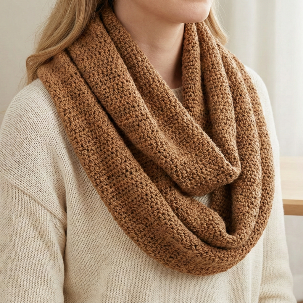 - Worsted weight yarn (brown): ~350 yd (since infinity is looped, you may need slightly more).