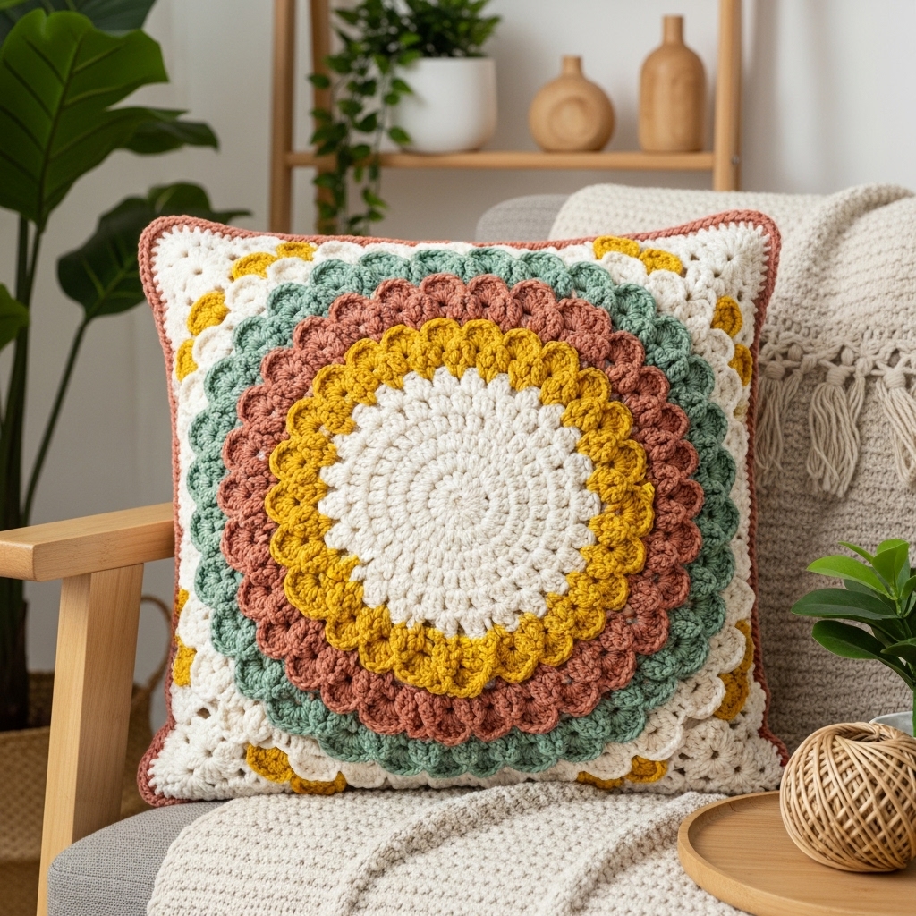 Sunbursts are classic boho: radiating petals or concentric rounds that read like mandalas. This pillow uses a central sunburst medallion worked outward in rounds and mounted on a square or circular cushion.