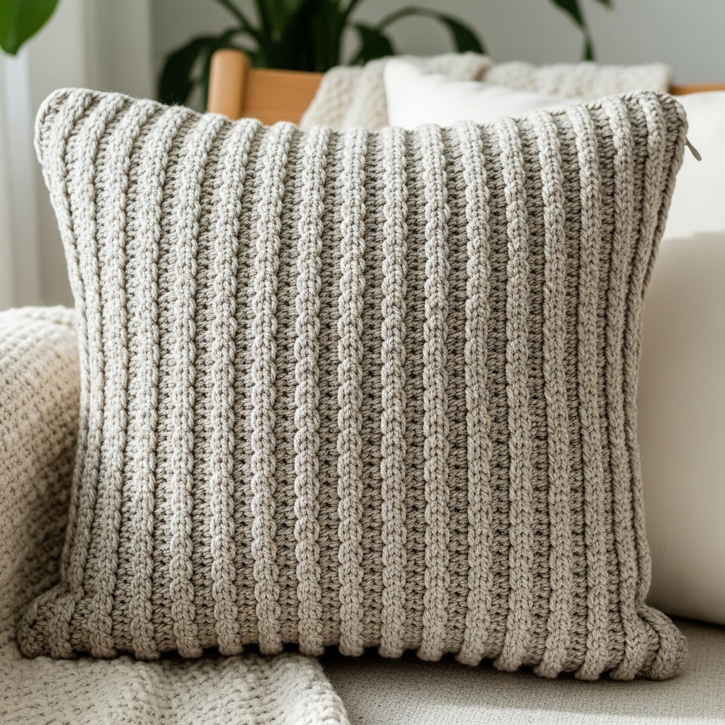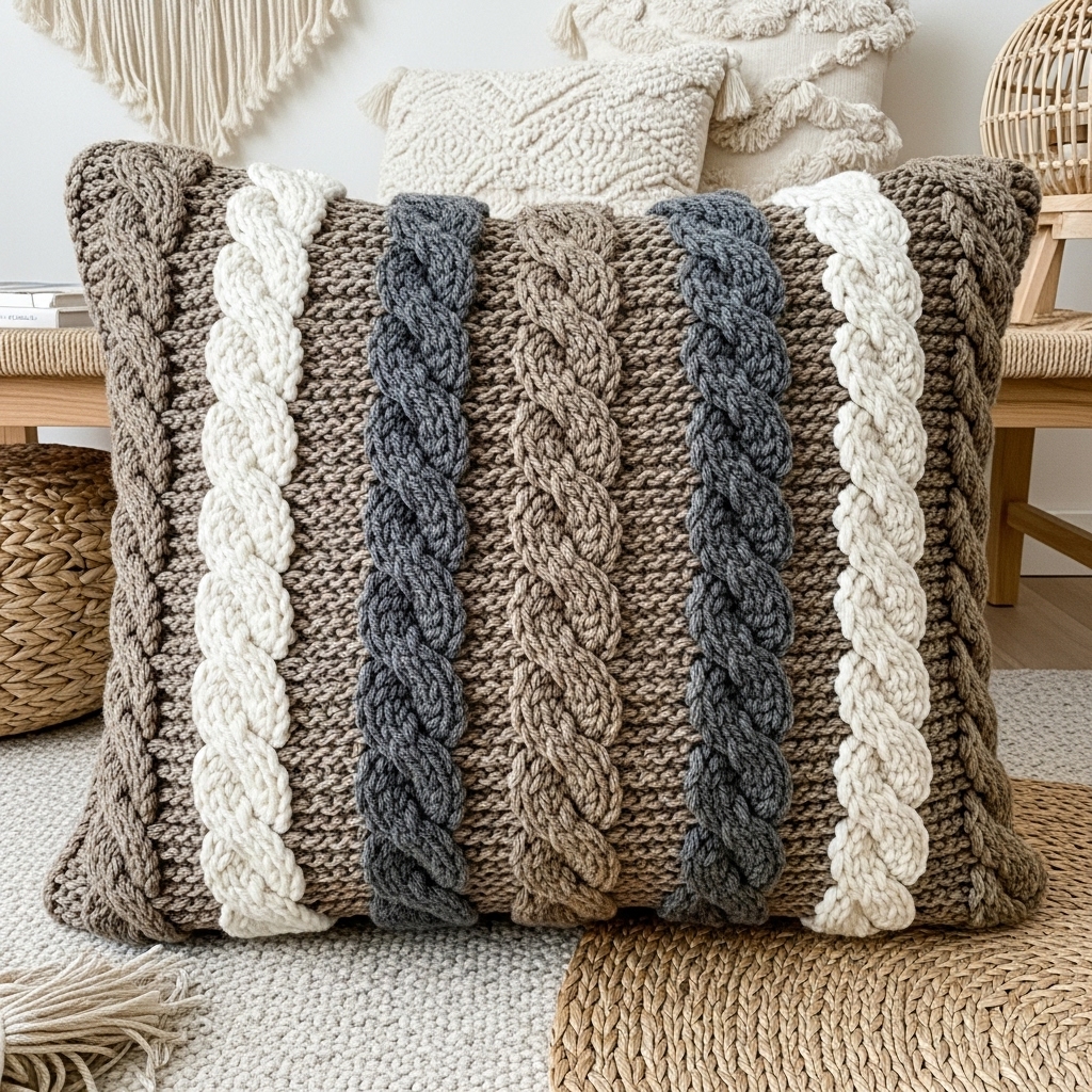 A richly textured pillow that mimics knitted cables using front- and back-post stitches or crossed stitch techniques. Cables add a heavy, cozy, boho feeling — ideal in neutral, rustic tones.