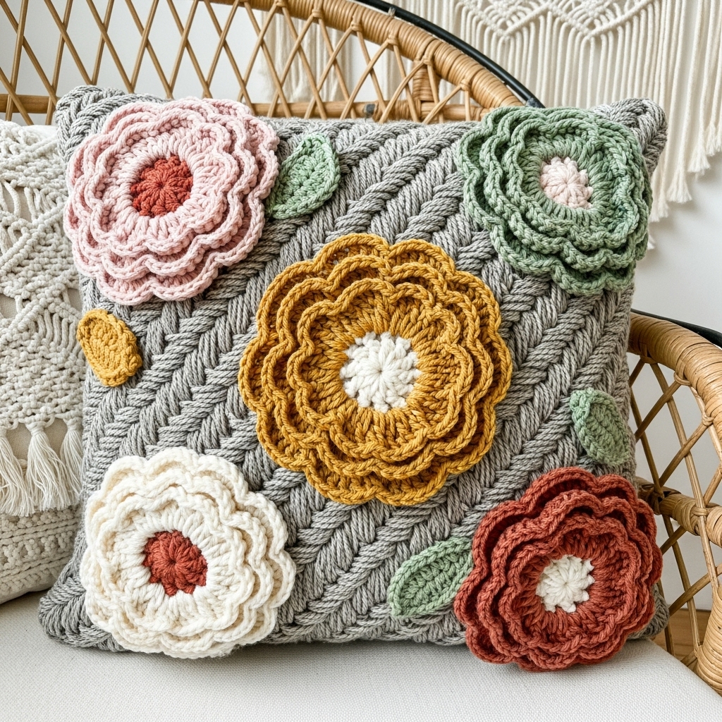 An ultra-boho pillow featuring raised floral appliqués (big central bloom or clustered blooms) on a textured ground. The flowers can be slightly three-dimensional for tactile interest.
