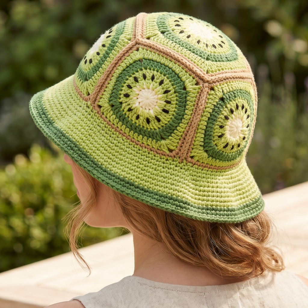 A kiwi-inspired granny square bucket hat is fun, fresh, and full of personality. The fruit theme gives it a cheerful, summery vibe, while the granny square construction makes it playful and creative. This hat is perfect if you want something unique and eye-catching.