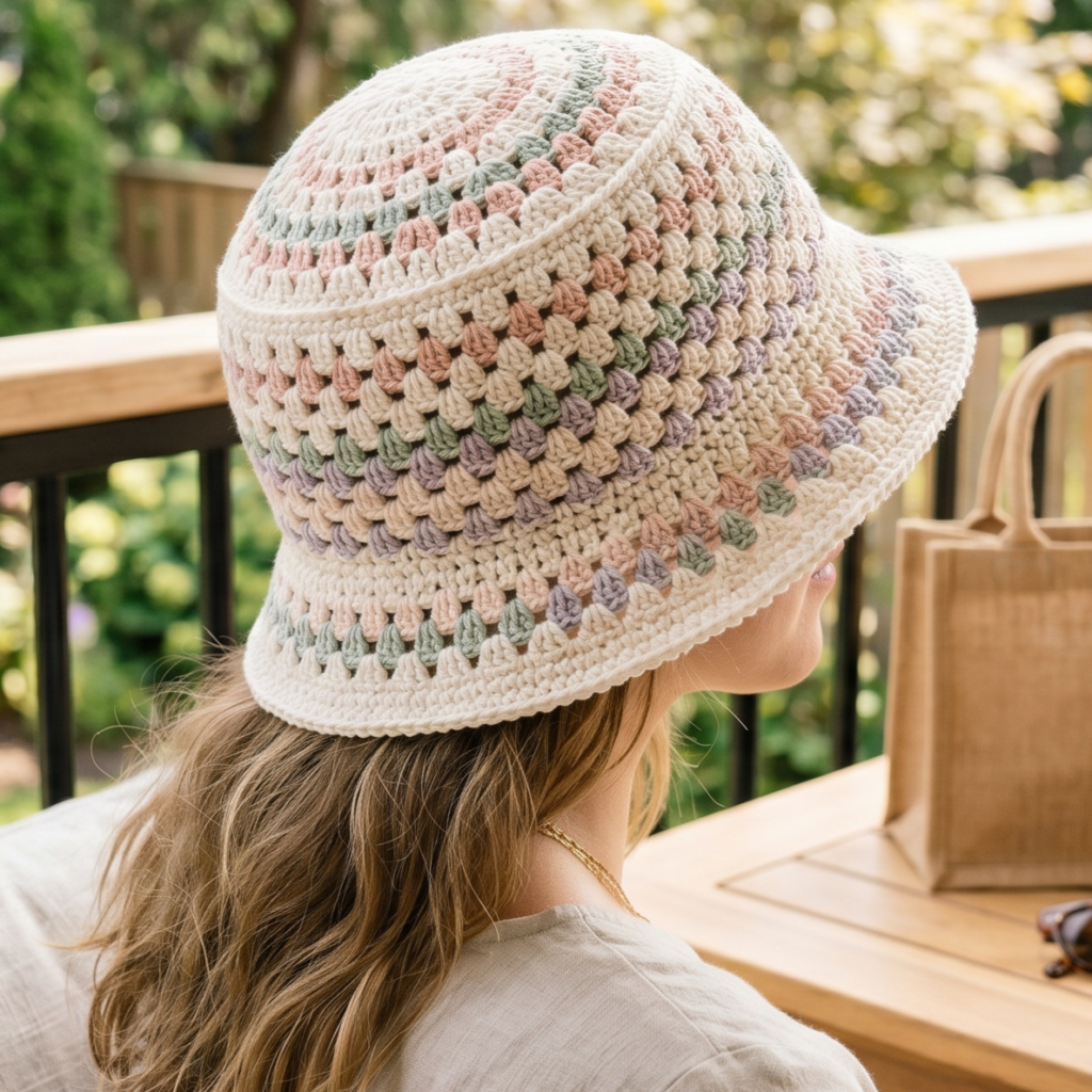 This hat looks especially lovely in cheerful solid colors or soft stripes. If you want a more classic summer look, choose cream, tan, or pastel shades. If you want something playful, use bright color blocks or rainbow granny stitch rows.