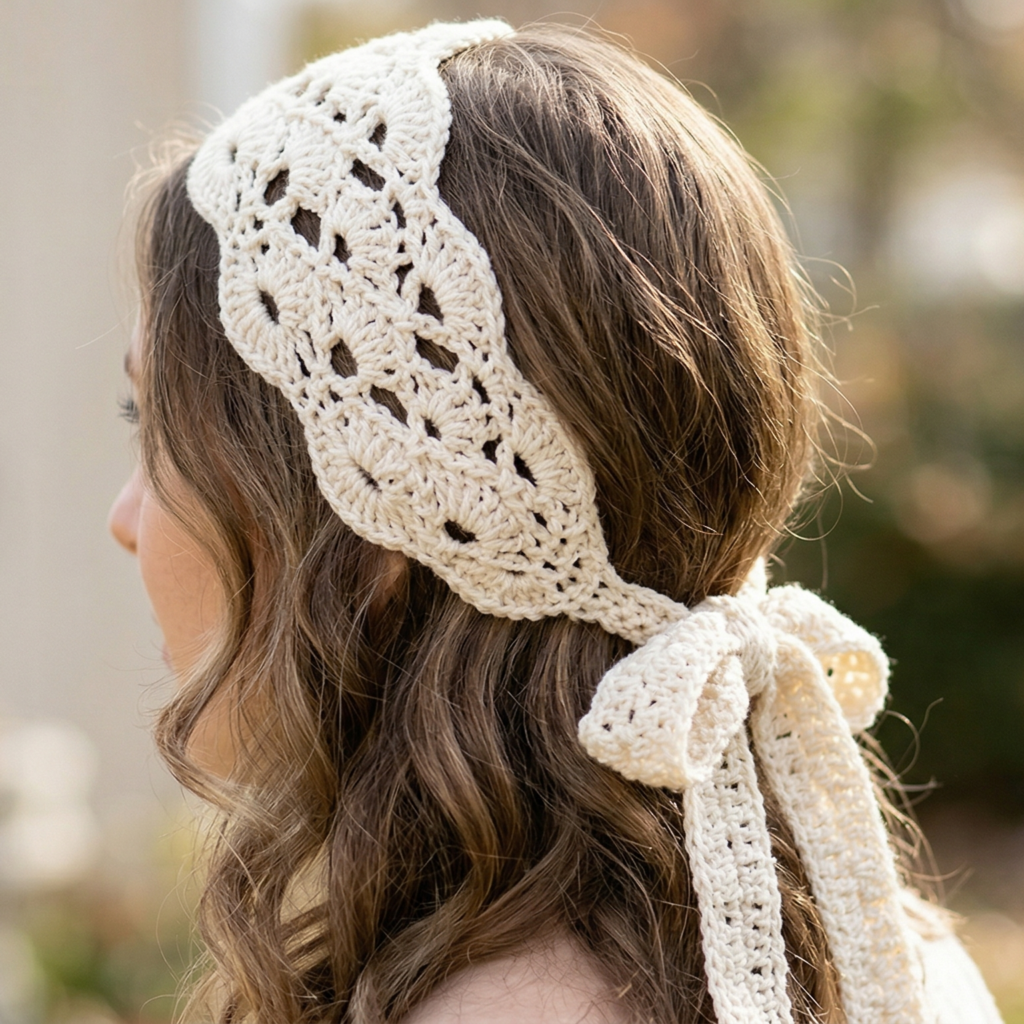 This headband begins with a foundation chain that allows the stitch pattern to open nicely without stretching too much. Because the design is meant to fold and tie, the foundation should be neat and even. Keep it loose enough to stay comfortable but not so loose that the headband loses structure.