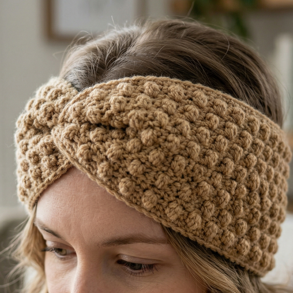 Follow your textured stitch repeat carefully. The tiny raised bumps should stay even across the strip. This pattern is especially forgiving for everyday wear because the texture hides small irregularities and gives the headband a handmade charm.