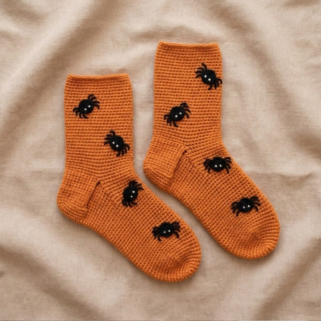 Overview: A fun, seasonal pair with a simple textured sock body and small crocheted spider appliqués sewn on as decoration. Great for Halloween or playful wardrobes.