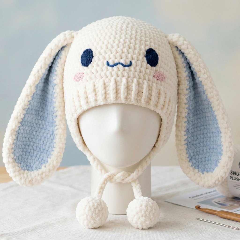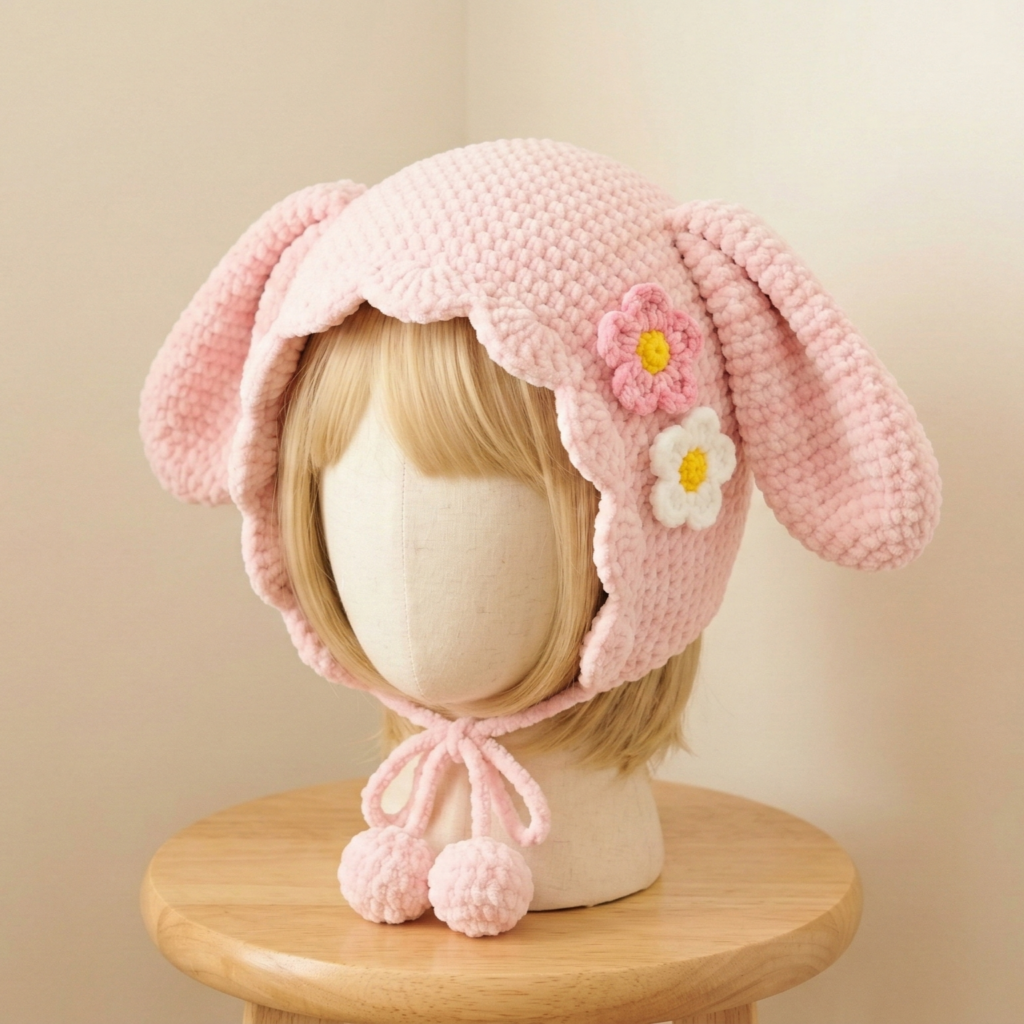 A sweet, plush lamb hat inspired by My Melody’s cozy look: rounded crown, hooded ear shaping, and cute lacy bow option. Plush yarn gives soft, toy-like texture; use embroidered face for kids.