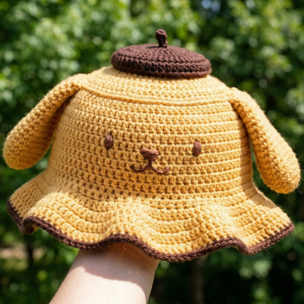 A relaxed bucket hat with a rounded crown and modest brim, topped with a jaunty beret-style little “cap” or pom — capture Pompompurin’s cozy pudding vibe.