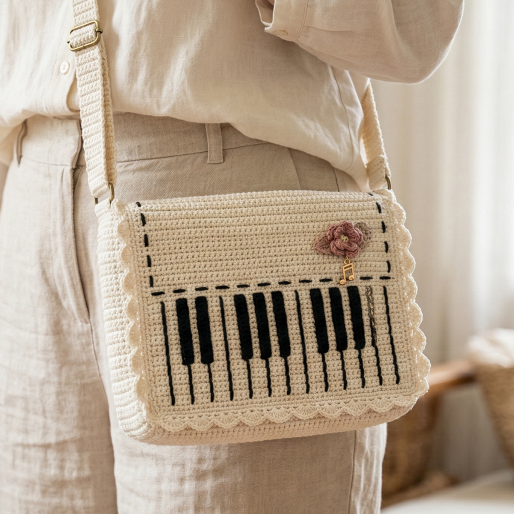 This bag looks especially beautiful in cream with black accents or in soft ivory with dusty rose details. If you want the piano motif to be more visible, keep the contrast simple and elegant. This design is perfect for anyone who loves a softer, romantic handmade style.