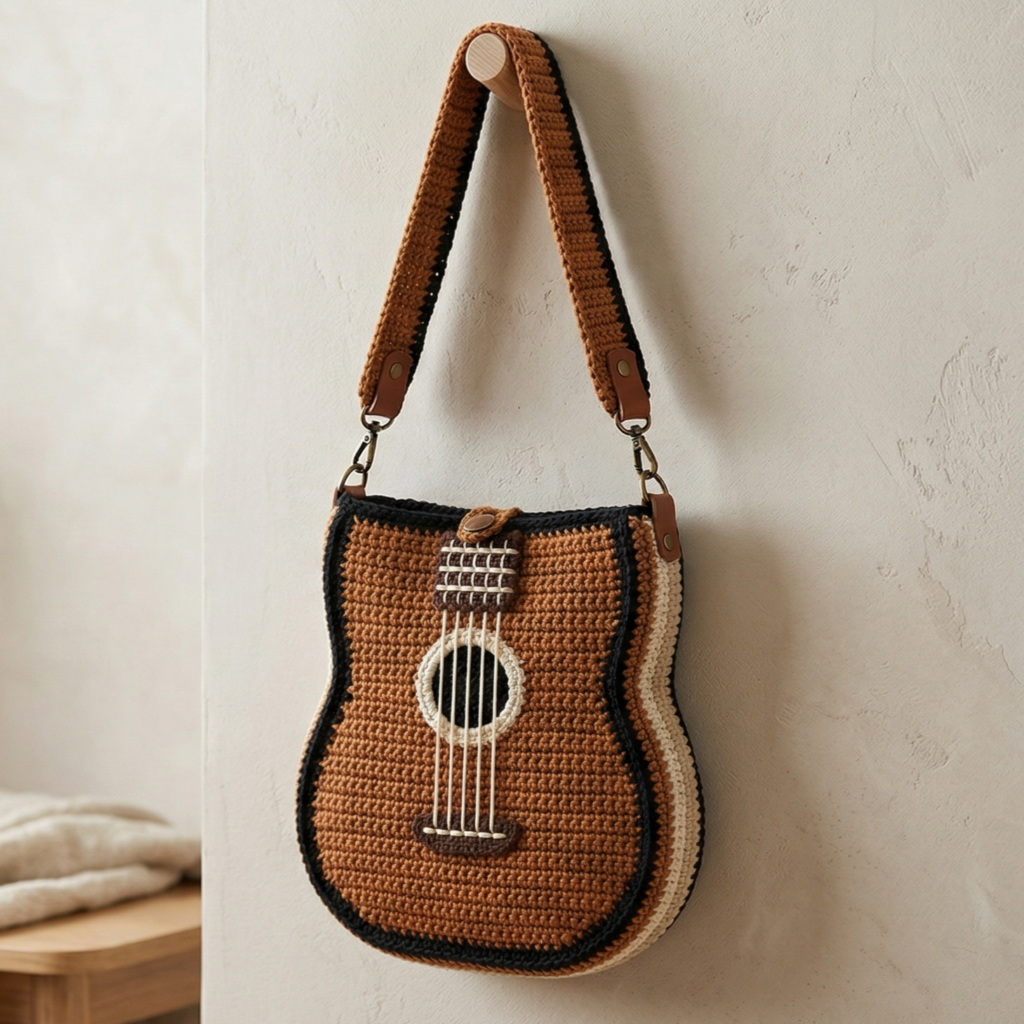 A guitar inspired crochet crossbody bag is bold, artistic, and full of personality. It is the kind of bag that feels creative without being overly complicated, and it is perfect for anyone who loves music-themed accessories. The shape and decorative details can be simple or more detailed depending on how much character you want to add.