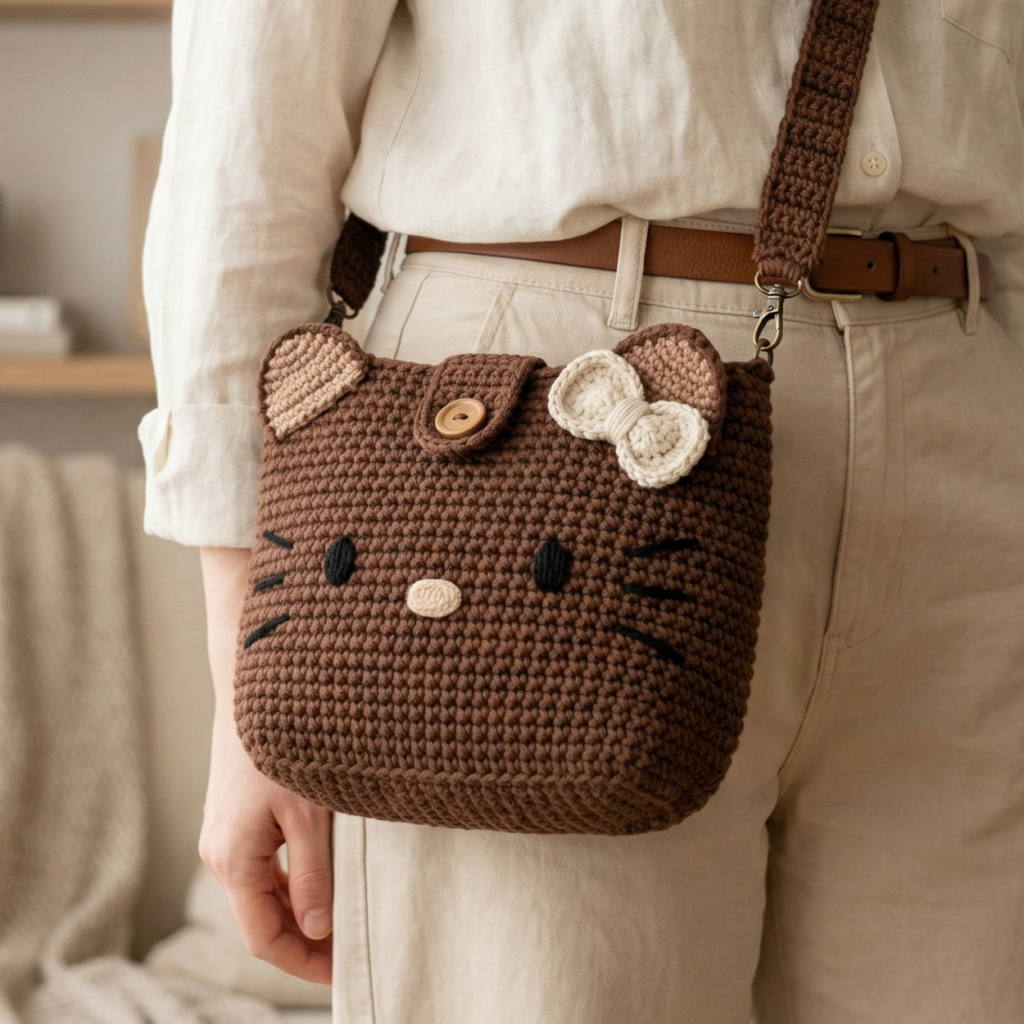 A brown character-inspired crossbody bag feels cute, whimsical, and a little nostalgic. The soft brown palette gives the design a warm and cozy appearance, while the character-inspired details make it instantly adorable. This is a perfect project if you love cute accessories that still feel wearable and stylish.