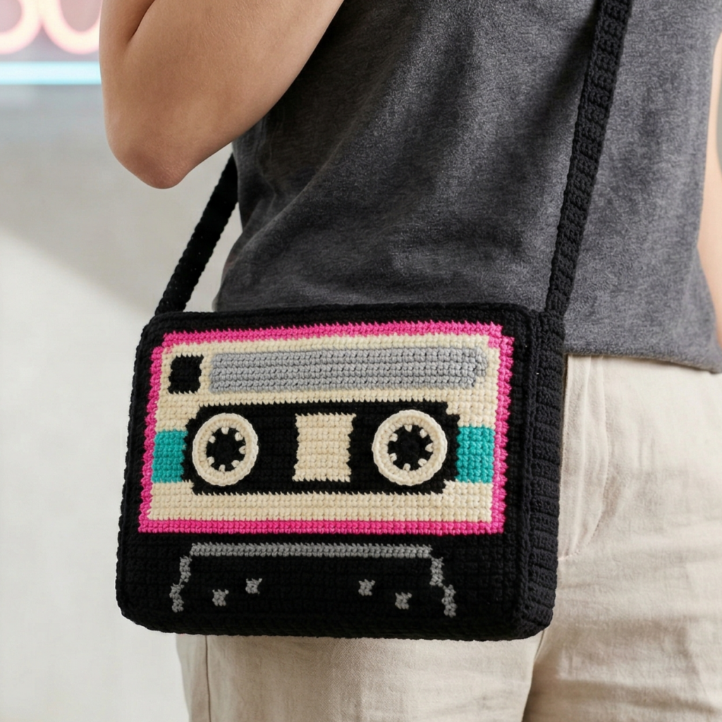A C2C cassette tape inspired bag brings a strong retro vibe that feels nostalgic and fun. The corner-to-corner construction makes it especially suitable for geometric shapes and graphic motifs, which is why it works so well for a cassette tape design. It is a wonderful project if you love 80s-inspired fashion and want a bag that feels both retro and trendy.