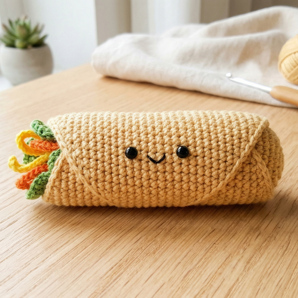 A spring roll amigurumi is a wonderful project for anyone who likes food-themed crafts. It is simple, neat, and quick to make. The rolled shape is easy to form, and the details can stay minimal or more detailed depending on your style.