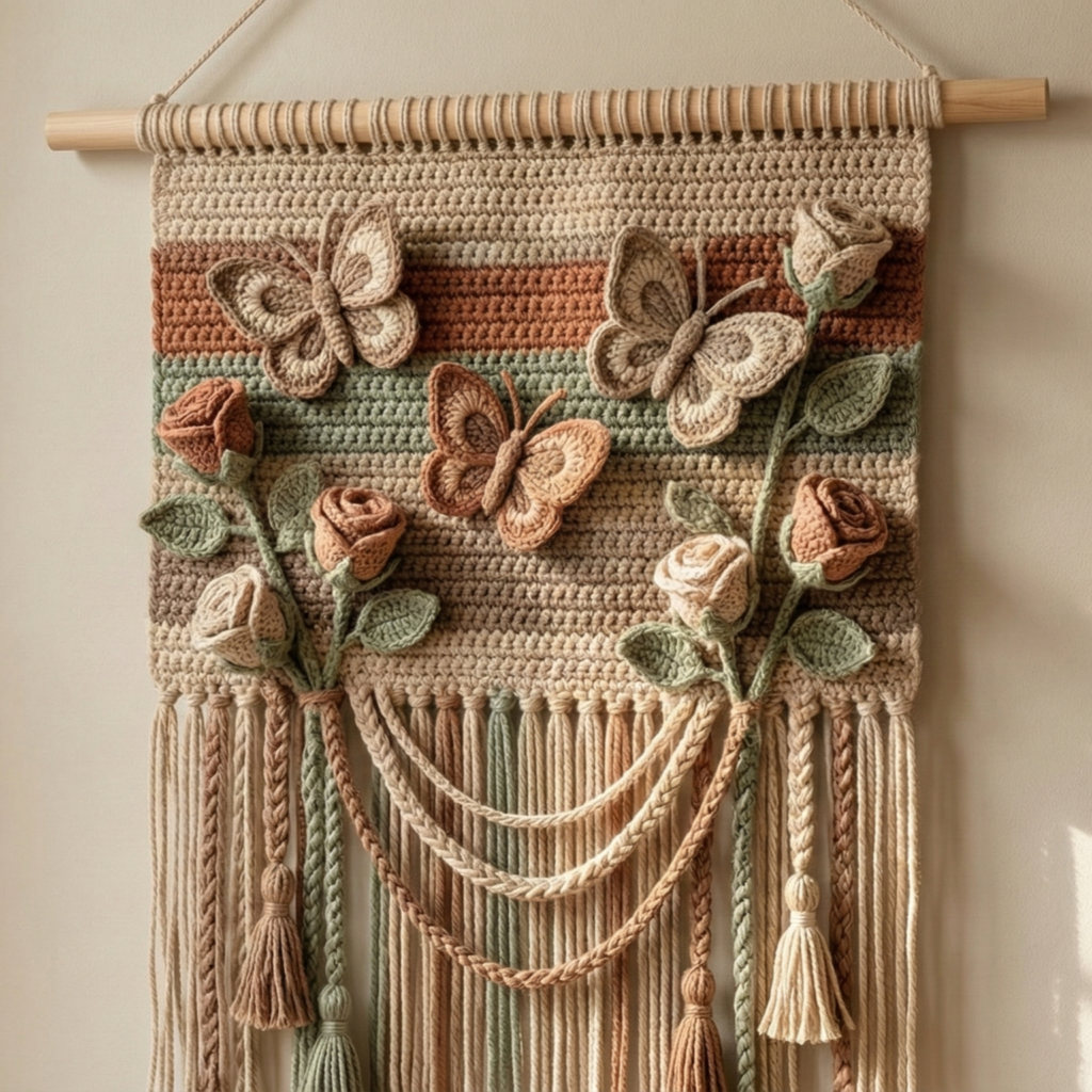 - A tapestry background (subtle stripes or muted gradient) with layered appliqués: 3D butterflies, crocheted rose buds and leaves, and hanging macramé cords for boho movement. Balance two techniques: a strong flat panel to read from a distance and sculptural elements that catch the eye.