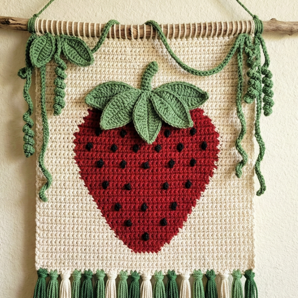 - A sweet, summery tapestry panel with large strawberry motif(s), embroidered seeds, and leafy macramé vines. The strawberry may be tapestry crocheted as a large shaped pixel motif, with appliqué leaves and a textured seed overlay (French knots simulated with small double-knot embroidery using yarn).