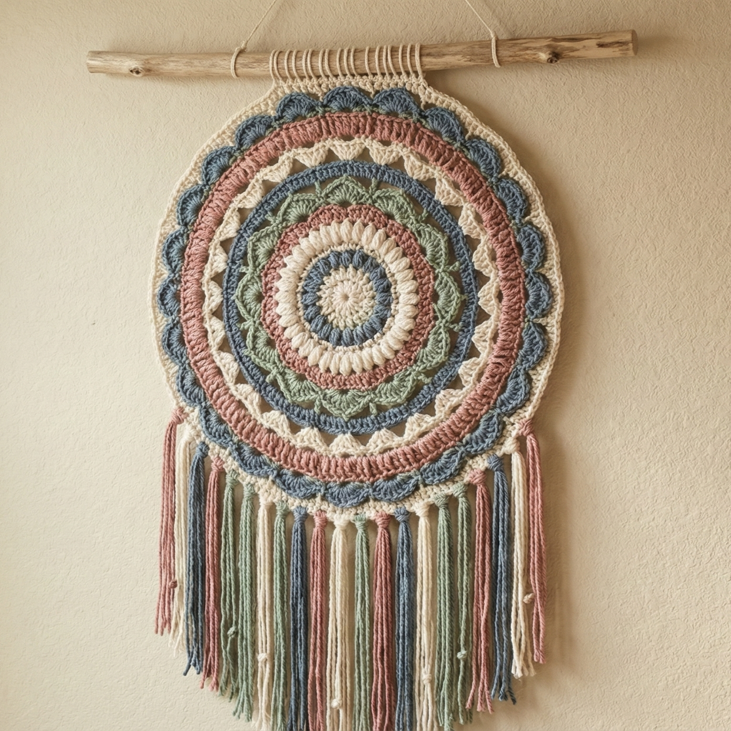 - Mandala worked in continuous rounds from center out. Use a balance of flat-round increases (to remain flat) and textured rounds (front/post, bobbles) to create 3D interest. Finish with decorative outer rounds and long fringes/tassels to hang from a dowel.