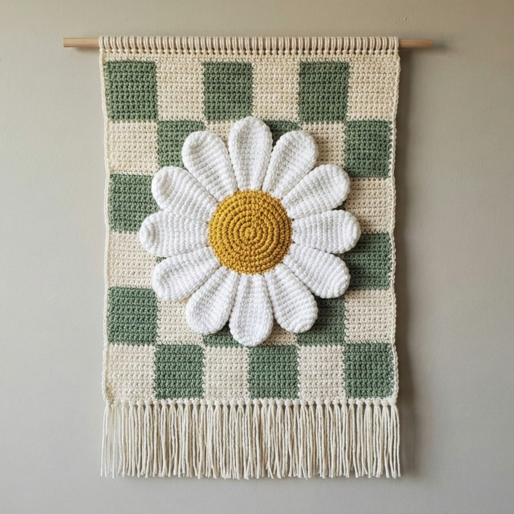 - A rectangular tapestry panel worked flat in tapestry crochet with a checkerboard background; daisies are added as small layered appliqués crocheted separately and sewn on. Bottom finished with geometric fringe and bead accents.
