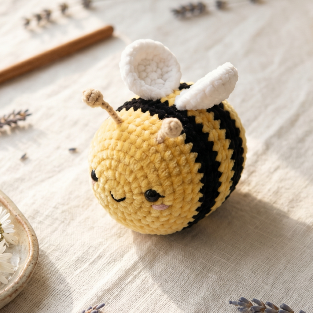 Smooth the stripes, adjust the wings, and make sure the bee sits or stands well. The finished plush should feel bright, cheerful, and full of personality.