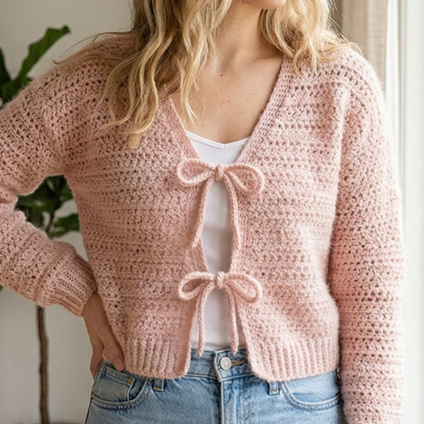 Start with a yarn that has good drape and feels gentle on the skin. A soft pastel, a warm neutral, or a gentle dusty tone can work beautifully for this design. Since the cardigan has a bow tie detail, a color that feels delicate and wearable will complement the shape nicely.