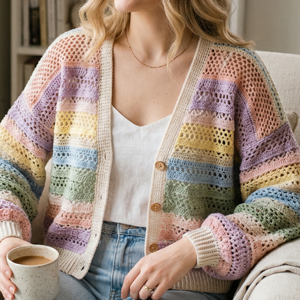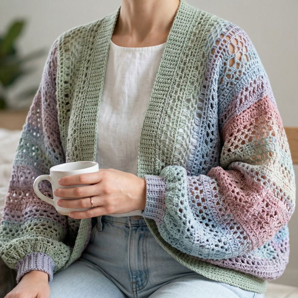 What makes crochet cardigans especially rewarding is that each design can feel completely different even when the construction is similar. One cardigan may look soft and romantic with lace and puff sleeves. Another may feel relaxed and airy with a cocoon shape. A striped cardigan can feel playful and casual, while a floral buttoned cardigan brings in a sweet handmade charm. That means you can make one for every season, every mood, and every wardrobe need.