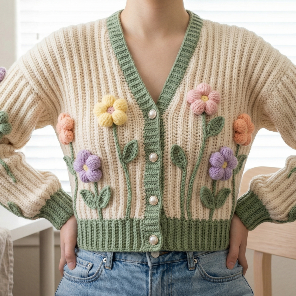 This cardigan looks especially beautiful in soft spring shades like cream, sage, blush, lavender, or butter yellow. If you want a more subtle floral piece, keep the flowers tonal. If you want a more playful look, use contrasting flower colors for a brighter blooming effect.