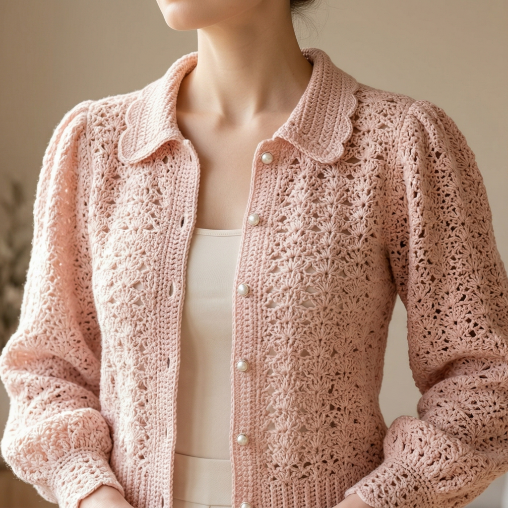 This cardigan looks especially beautiful in ivory, blush, dusty rose, or soft gray. If you want it to feel more romantic, choose pearl-style buttons. If you want a more everyday version, use a soft neutral yarn and keep the collar simple.