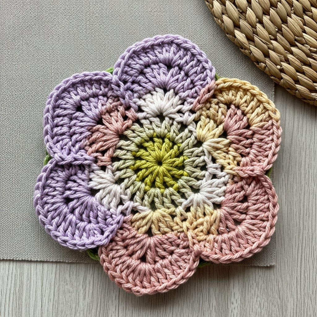 Construction concept: Work a flat circular base, then make a layer of petal clusters in rounds to create a petunia look. Optionally attach a small felt disc on the underside for absorbency and surface protection.