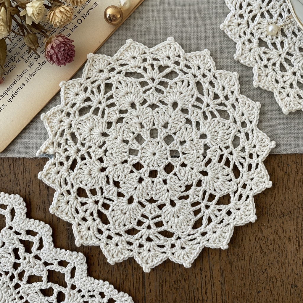 - Typical yarns: sport/DK cotton or worsted-weight cotton depending on the texture you want. For tighter, more durable coasters use worsted cotton + 4.0 mm hook (G/6) or a slightly smaller hook. For lacy vintage coasters use cotton thread size 10 + 1.75–2.25 mm hook.