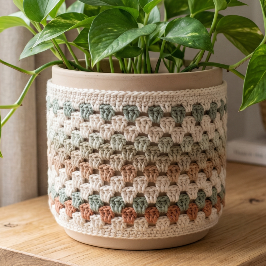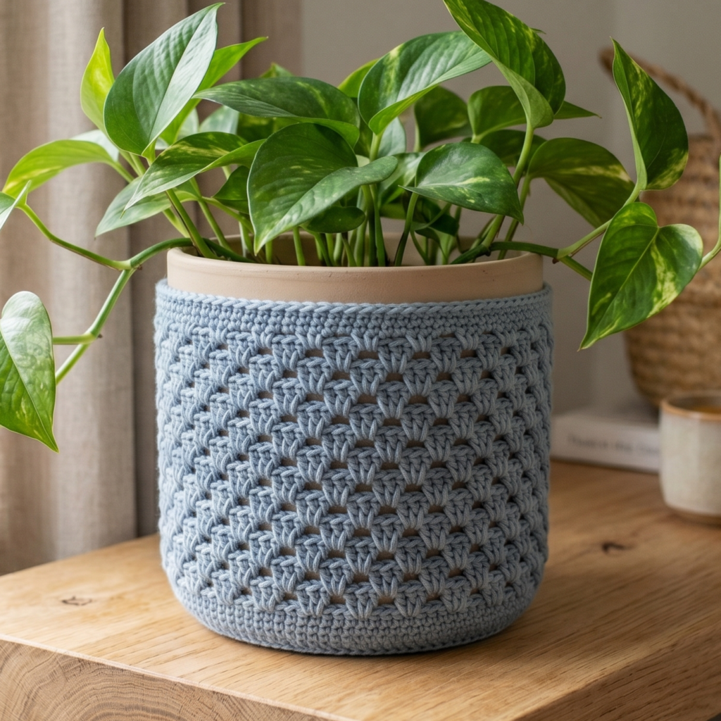 A granny stitch plant cover is classic, cozy, and easy to customize. The open stitch texture gives it a relaxed handmade feel, while the familiar granny clusters make it quick and satisfying to work. It is a great pattern if you want a cover that feels a little rustic but still polished enough for modern home decor.