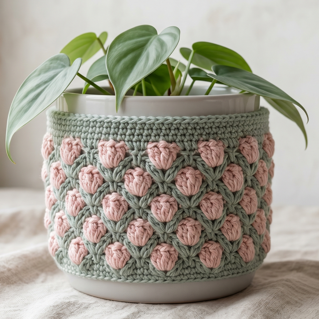 This plant cover looks especially beautiful in muted pink, dusty green, or creamy white. If you want a very soft, elegant version, keep the color palette gentle and the stitch texture consistent. It is a lovely choice for decorative indoor plants.
